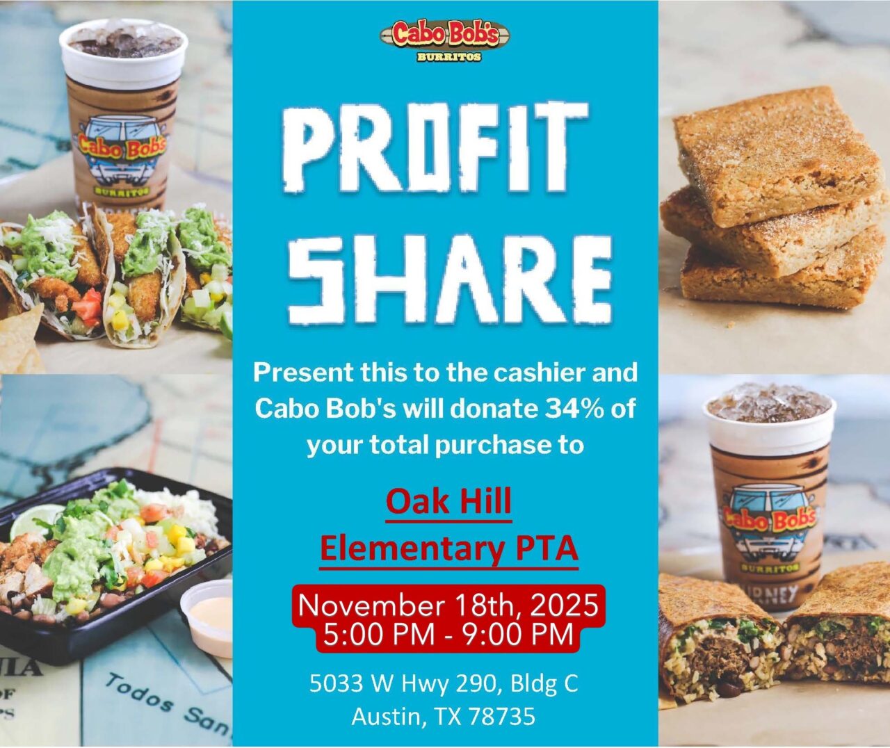 Join us for a Family Fun at Cabo Bob’s on 290! Share this flyer and they will donate 34% of your purchase will be donated to OHE!